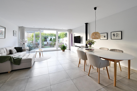 Bij binnenkomst in de woning kom je terecht in de hal met toegang tot de woonkamer. De woonkamer is verrassend ruim en licht, met een charmant balkenplafond en een groot raam aan de voorzijde dat zorgt voor veel natuurlijke lichtinval. De ruimte is eenvoudig maar sfeervol afgewerkt, met voldoende plek voor een comfortabele zithoek en een eethoek.